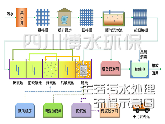 好氧池、MBR 膜組件、消毒設(shè)備、設(shè)備間等,配套設(shè)備包括風(fēng)機(jī)、泵、